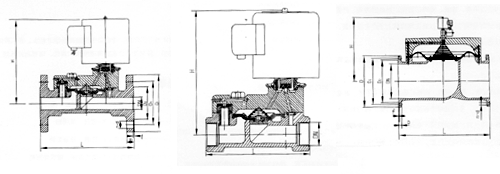 三、ZCS水用電磁閥特點(diǎn) 結(jié)構(gòu)簡(jiǎn)單,體積小,密封性能好,維修方便。 四、ZCS水用電磁閥結(jié)構(gòu)原理 ZCS水用電磁閥通徑15~100為膜片式為二次開閥的先導(dǎo)式電磁閥,通徑125~300為三次開閥的先導(dǎo)式電磁閥,其結(jié)構(gòu)主要由副閥和主閥組成。 根據(jù)斷電時(shí)所處開關(guān)狀態(tài)的不同,可分為常閉電磁閥和常開電磁閥。常閉電磁閥,常位時(shí),活動(dòng)鐵芯封住副閥口,閥腔內(nèi)壓力平衡,副閥、主閥口封閉。當(dāng)線圈通電,產(chǎn)生電磁力將活動(dòng)鐵芯吸上,副閥打開,主閥腔內(nèi)的介質(zhì)自導(dǎo)閥門外泄,以致主閥閥杯上下產(chǎn)生壓力差,膜片或閥杯被迅速托起,主閥口開啟,閥呈通路狀態(tài)。 當(dāng)線圈斷電,磁場(chǎng)消失,活動(dòng)鐵芯復(fù)位,封閉副閉口,斷而副閥和主閥閥杯內(nèi)壓力上升,主閥閥杯壓向閥座,閥又呈關(guān)閉狀態(tài)。 常開電磁閥,當(dāng)線圈通電時(shí),產(chǎn)生磁力,銜鐵在磁力作用下下移,推動(dòng)副閥閥杯下移,副閥關(guān)閉,隨著主閥閥杯上下壓差趨向相等,主閥閥杯由自重壓向密封面,閥門關(guān)閉。當(dāng)線圈斷電后,磁力為零,銜鐵和副閥閥杯由于彈簧作用上升,副閥打開,主閥閥杯內(nèi)介質(zhì)經(jīng)副閥流走,壓力下降,當(dāng)壓力降到一定值后,主閥閥杯由上下壓差作用向上升起,主閥打開,閥門開啟。