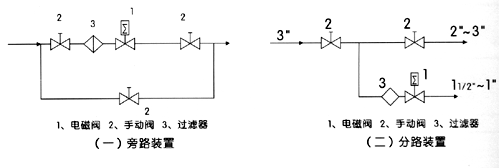 七、ZCS水用電磁閥安裝須知 1、安裝時(shí)電磁閥線圈向上,并保持垂直位置,電磁閥上箭頭或標(biāo)記應(yīng)與管道流向一致,不得安裝在有濺水或漏水的地方。 2、電磁閥的工作介質(zhì)應(yīng)清潔無顆粒雜質(zhì),電磁閥內(nèi)件表面上的污物及過濾器,需定期清潔干凈。 3、在電磁閥發(fā)生故障時(shí),為了及時(shí)隔離電磁閥,并保證系統(tǒng)正常運(yùn)行,最好安裝旁路裝置(如圖一)。 4、在管路系統(tǒng)中,安裝在支路上的電磁閥通徑應(yīng)小于主管道閥門的通徑(如圖二)。 5、安裝在電磁閥前,管道必須清洗干凈。建議在閥前安裝過濾器,蒸汽管道安裝疏水閥。 6、不能將閥安裝在管道的低凹處,以免因蒸汽冷凝水、雜質(zhì)等沉淀在閥內(nèi)而妨礙動(dòng)作。 7、普通型不能在爆炸危險(xiǎn)場(chǎng)合使用。 8、在管路剛性不足情況下,建議把閥前管道用支架固定,以免電磁閥工作時(shí)引起振動(dòng)。 9、在安裝前,要注意要看清產(chǎn)品標(biāo)牌,認(rèn)真閱讀使用說明書,判斷產(chǎn)品是否符合使用條件。 10、電磁閥前后管道上需安裝壓力表,以便觀察管道壓力。