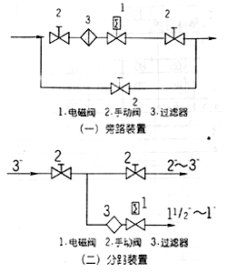 蒸汽電磁閥安裝須知 1、安裝時電磁閥線圈向上,并保持垂直位置,電磁閥上箭頭或標記應與管道流向一致,不得安裝在有濺水或漏水的地方。 2、電磁閥的工作介質應清潔無顆粒雜質,電磁閥內件表面上的污物及過濾器,需定期清潔干凈。 3、在電磁閥發生故障時,為了及時隔離電磁閥,并保證系統正常運行,最好安裝旁路裝置(如圖一)。 4、在管路系統中,安裝在支路上的電磁閥通徑應小于主管道閥門的通徑(如圖二)。 5、安裝電磁閥前,管道必須清洗干凈。建議在閥前安裝過濾器,蒸汽管道安裝疏水閥。 6、不能將閥安裝在管道的低凹處,以免因蒸汽冷凝水、雜質等沉淀在閥內而妨礙動作。 7、普通型不能在爆炸危險場合使用。 8、在管路剛性不足情況下,建議把閥前管道用支架固定,以免電磁閥工作時引起振動。 9、在安裝前,要注意看清產品標牌,認真閱讀使用說明書,判斷產品是否符合使用條件。 10、電磁閥前后管道上需安裝壓力表,以便觀察管道壓力。