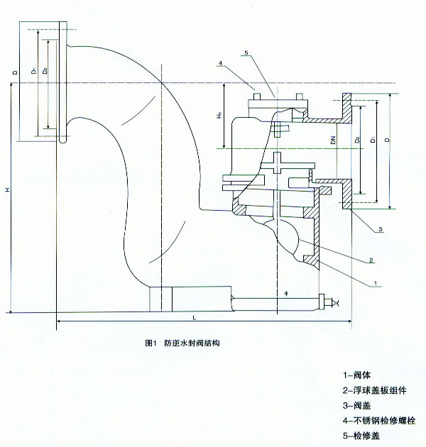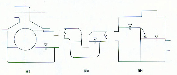 1、本防逆封閥裝于清水池溢流管上,以前的防逆水封閥(圖2)及存水彎(圖3)或溢流井(圖4)在閥內無水時,均不能阻隔臭氣進入清水池,而當清水池進口浮球鞋閥很好時,尤其是新建水池,往往很少溢流甚至數年無溢流,因而,上述三種裝置均不能防止下水道臭氣進入清水池,而本防逆水封閥的蓋板浮球結構則可無論是否有水均可阻隔臭氣,保持清水池良好的衛生狀況。